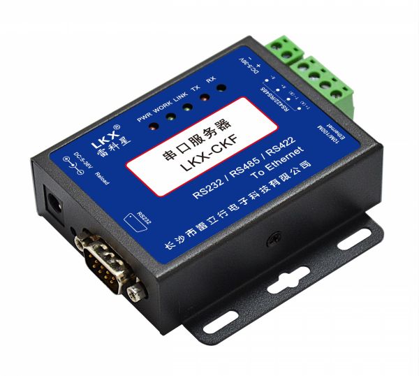 LKX-CKF串口服務器是一款實現RJ45網口與RS232或RS485、RS422接口之間直接的數據透明傳輸的設備。串口種類齊全,方便客戶使用,同時支持端子電源供電和電源座供電,可供客戶自行選擇。搭載ARM處理器,功耗低,速度快,穩定性高。