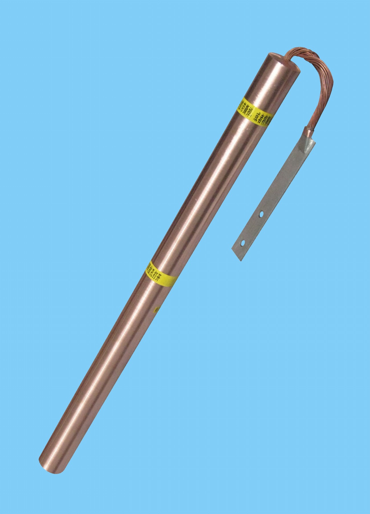 3. 將電解離子接地極從包裝中取出,檢查產(chǎn)品是否完整(電解離子接地極一端焊接了一段95mm2銅線,銅線上再焊接了一塊鍍鋅扁鐵,其上開了兩個(gè)直徑為12mm的圓孔,孔中心距為63mm)。